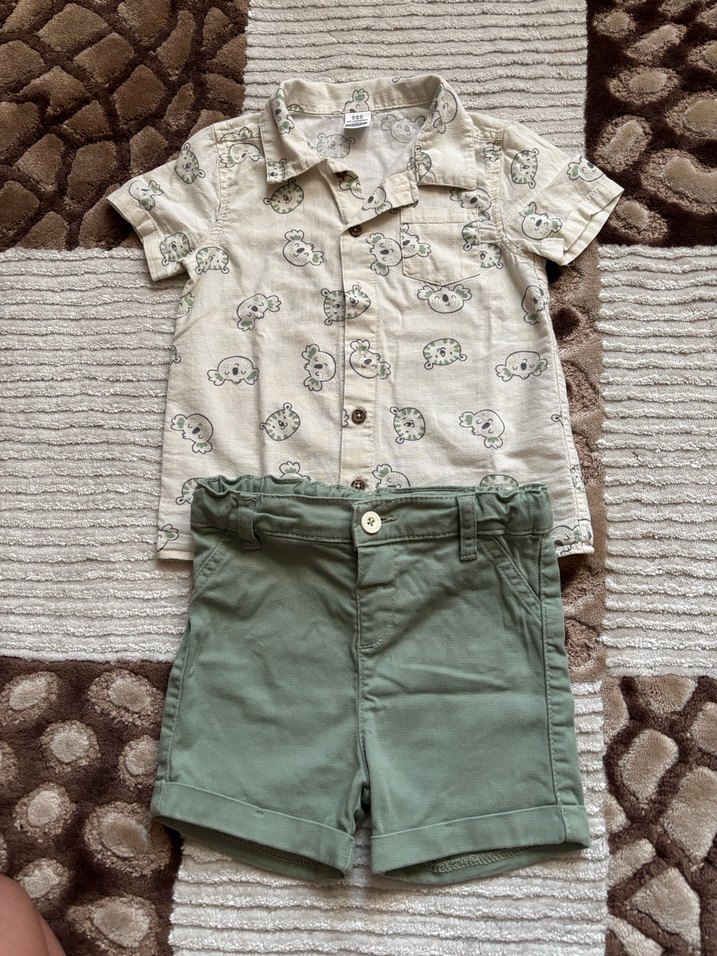 Kısa kollu, düğmeli ve yakası kesik desenli pamuklu gömlek ile yeşil şorttan oluşan erkek bebek takımı. Rahat ve yumuşak kumaşlıdır.