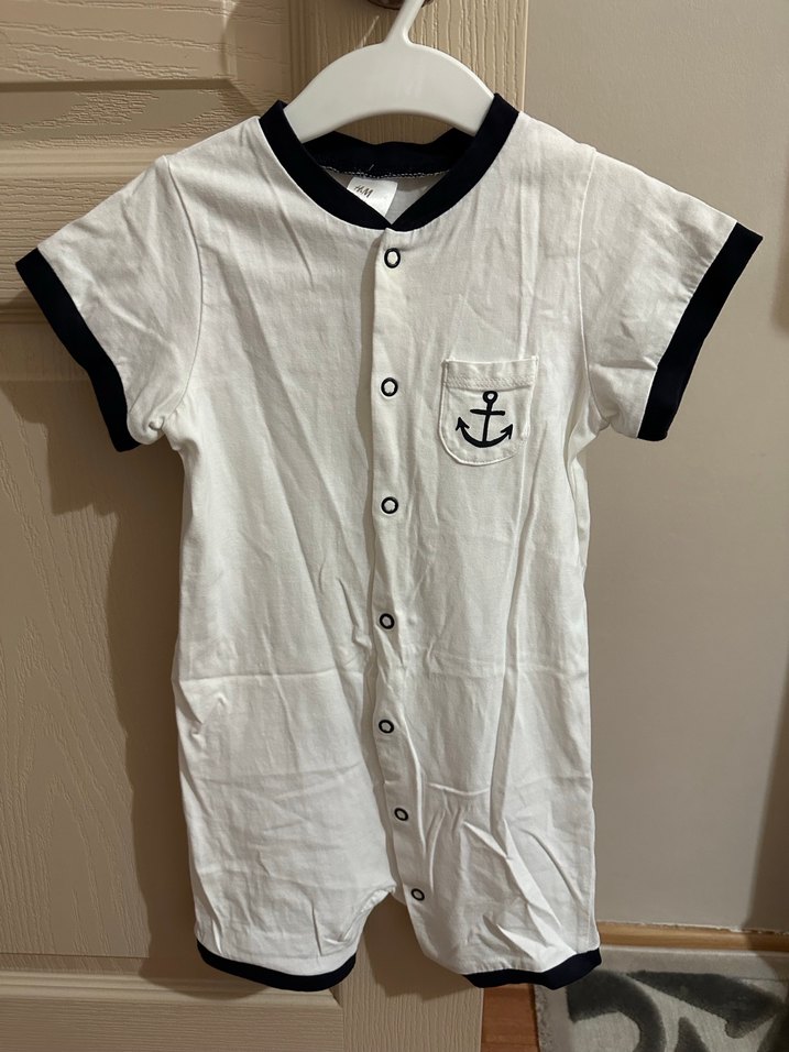 Pamuklu beyaz erkek bebek tulumu, kısa kollu ve düğmeli. Koyu renk detaylar ve göğüs cebinde küçük çapa baskısı bulunur. ⚓