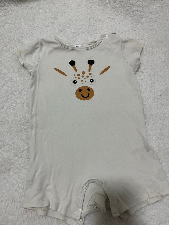 Pamuklu beyaz erkek bebek tulumu, kısa kollu ve bisiklet yaka. Zürafa baskısı ve düğmeli kapanış bulunur.