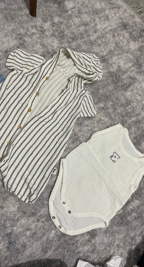Pamuklu, kısa kollu iki erkek bebek tulumu. Biri düğmeli, yakalı ve çizgili; diğeri beyaz, gri işlemeli ve çıtçıtlıdır.