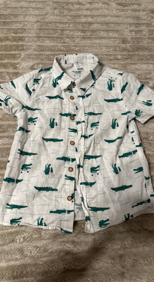 Erkek çocuklar için düğmeli, kısa kollu ve yakalı bu gömlek, rahat kesimi ve yumuşak keten kumaşıyla dikkat çeker. Gri zemin üzerinde eğlenceli timsah baskısı bulunur.