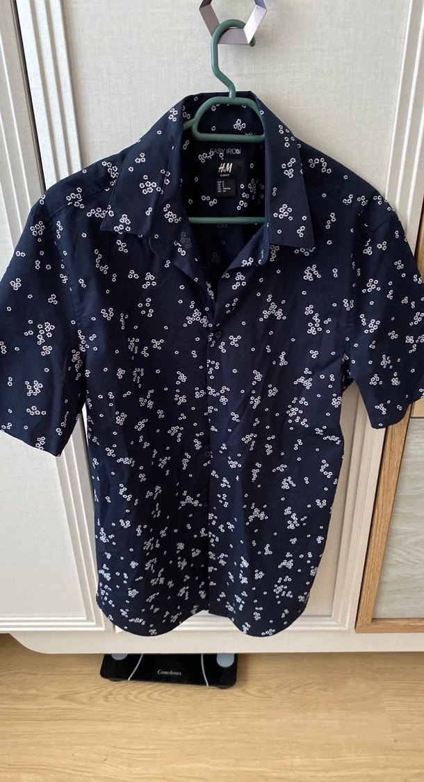 Pamuk kumaştan yapılmış, düğmeli, kısa kollu, bol kesim erkek gömlek. Koyu mavi tie-dye desenli, günlük rahat stil için uygun.