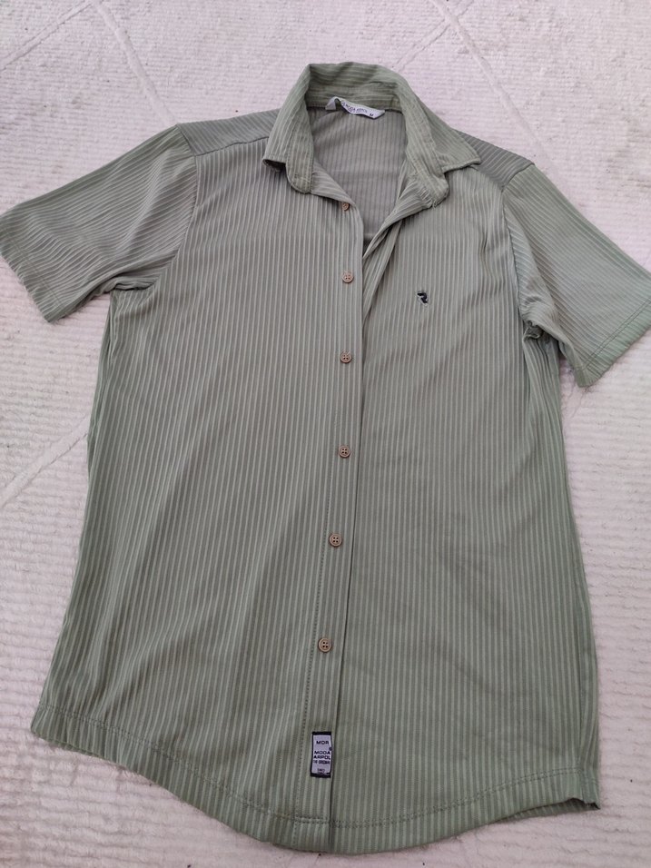 Düğmeli, kısa kollu erkek gömlek, yakalı ve hafif çizgili desende, yeşil ve gri tonlarında. Rahat kesimi ve yumuşak sentetik kumaşıyla günlük kullanıma uygundur. sıfır