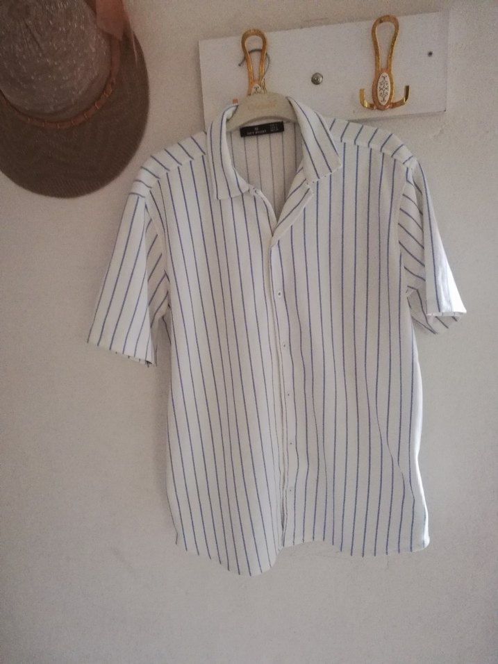 Düğmeli kısa kollu, yakalı erkek gömleği. Beyaz zemin üzerine ince dikey gri çizgilerle, keten kumaştan, normal kesim ve günlük sokak stili için uygun.