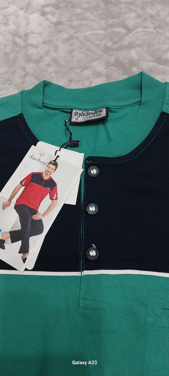 Düğmeli ön kısmı, kısa kollu ve yuvarlak yakalı erkek pijama takımı. Regular fit ve koyu yeşil renkte, casual sokak stili için uygundur.