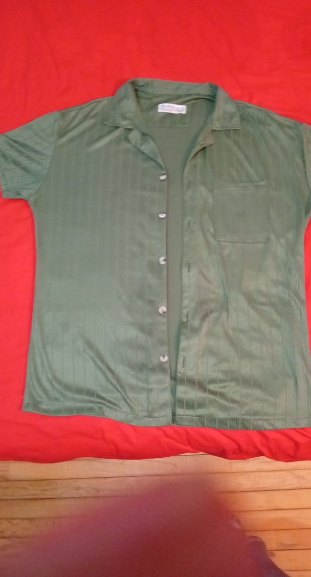 Düğmeli, kısa kollu, yeşil erkek gömleği. Notch yaka ve bol kesimle rahat bir kullanım sunar. Hafif sentetik kumaştan, günlük sokak stili için uygundur.