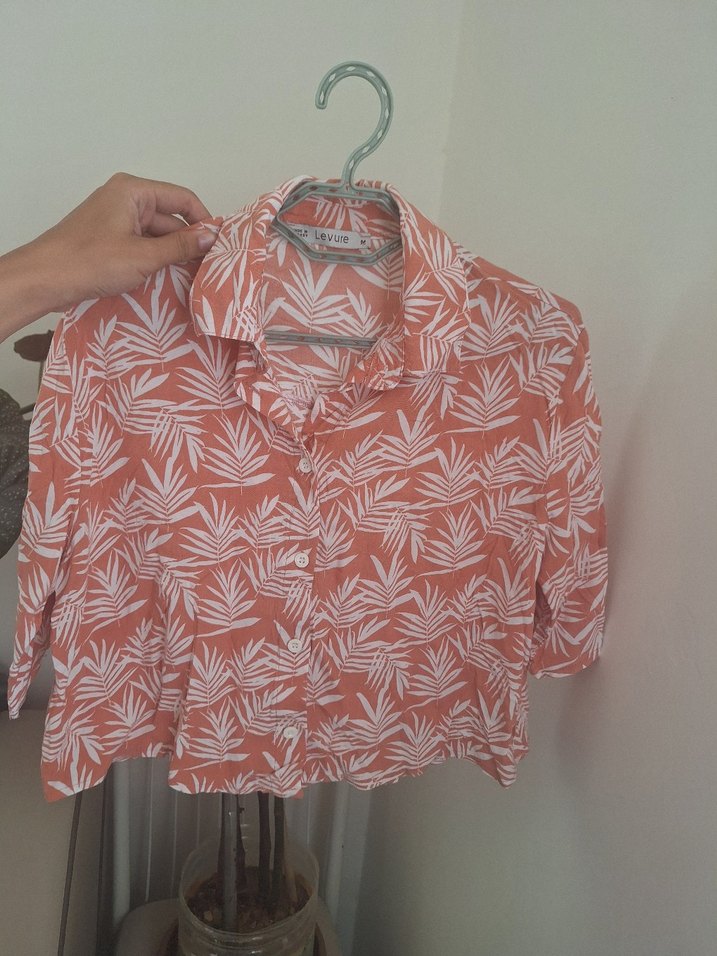 somon renk crop, düğmeli ve kısa kollu gömlek. Salaş kesim, yakalı sıfır ürün