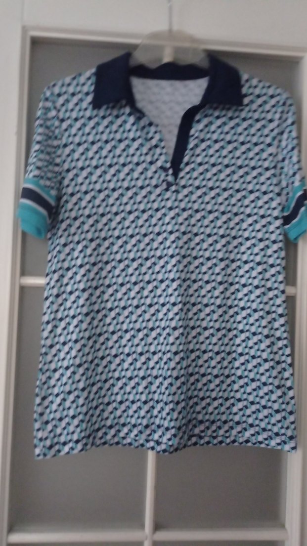 Düğmeli ön kısmı, kısa kollu ve yakalı bu bol kesim gömlek, mavi ve gri geometrik desenlidir. Rahat tekstil kumaşından üretilmiştir, günlük kullanıma uygundur.