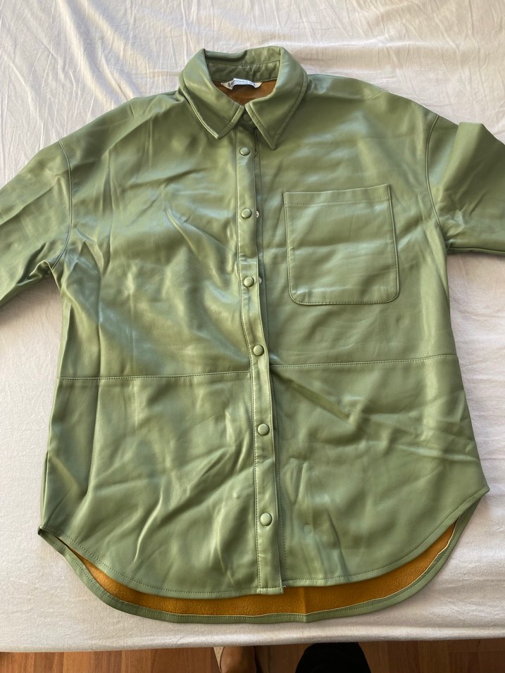 Düğmeli, kısa kollu, yakalı, tek cep detaylı, parlak görünümlü, bol kesim haki deri ceket. Günlük rahat kullanıma uygundur.