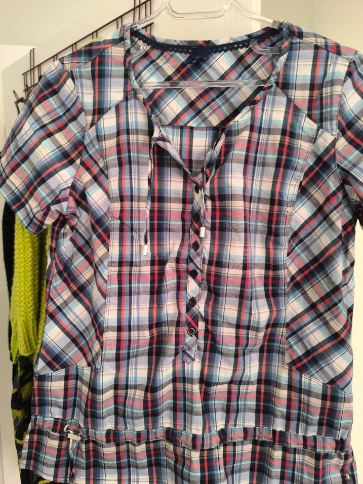 Düğmeli, kısa kollu, yakalı ve bol kesimli kadın gömleği. Gri tonlarında çok renkli kareli desenlidir, günlük kullanıma uygundur. cecile 38 beden