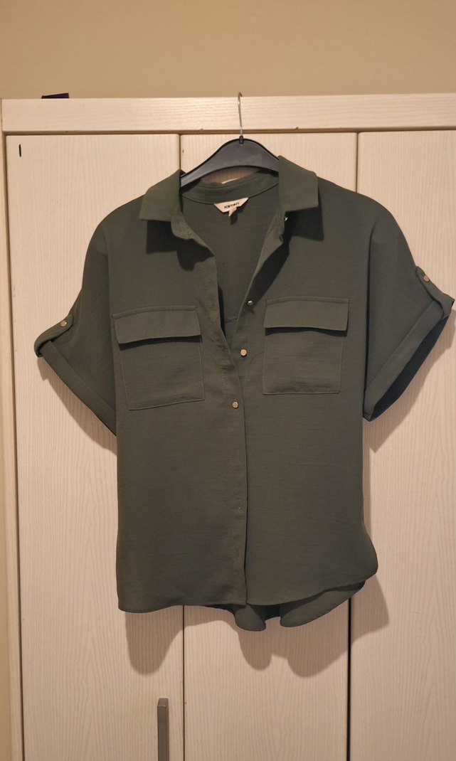 Düğmeli, kısa kollu, yakalı ve bol kesim kadın gömlek. Khaki renkte, sentetik dokulu kumaştan yapılmış, günlük sokak stili için uygun.