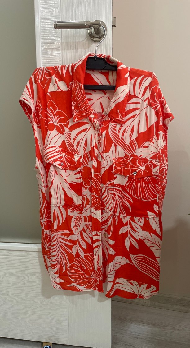 Düğmeli, V yaka, kısa kollu, bol kesim kadın gömlek. Canlı kırmızı-beyaz desenli, yumuşak sentetik kumaştan, bohem tarzda günlük kullanım için uygun.