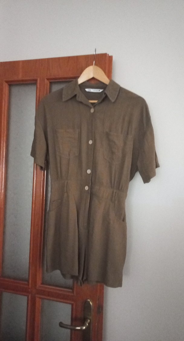Düğmeli, kısa kollu haki yesil keten tulum, yakalı ve bol kesimdir. Günlük rahat sokak stili için uygundur.
