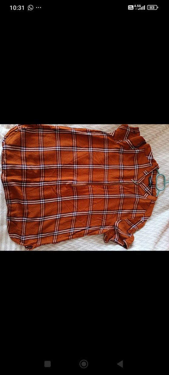Bol kesim, kısa kollu kahverengi ekose gömlek. Yaka kısmı düğmeli ve tekstil kumaştan üretilmiştir. Günlük sokak stiline uygundur.