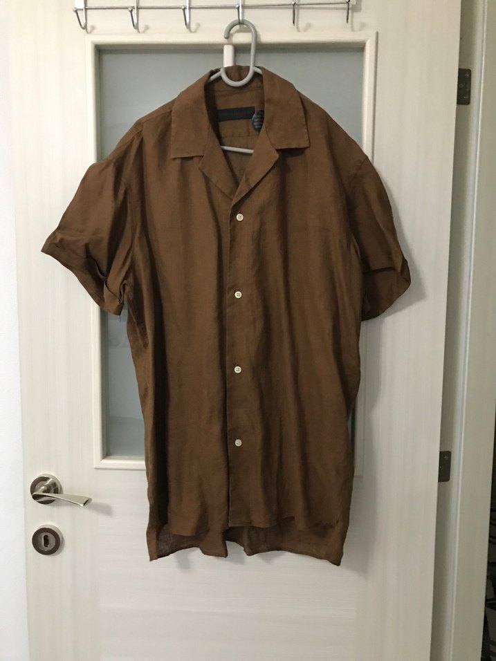 Oversize rahat salaş gömlek kullanılmamıştır Notlu yakalı, düğmeli ve kısa kollu kahverengi keten gömlek. Rahat kesimi ve parlak rengiyle günlük ofis stiline uygundur.