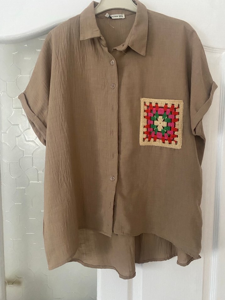Düğmeli, kısa kollu kahverengi keten gömlek, yaka detaylı ve renkli işlemeli cep ile bohem tarzda rahat kesim. Göğüs kısmı 55 cm