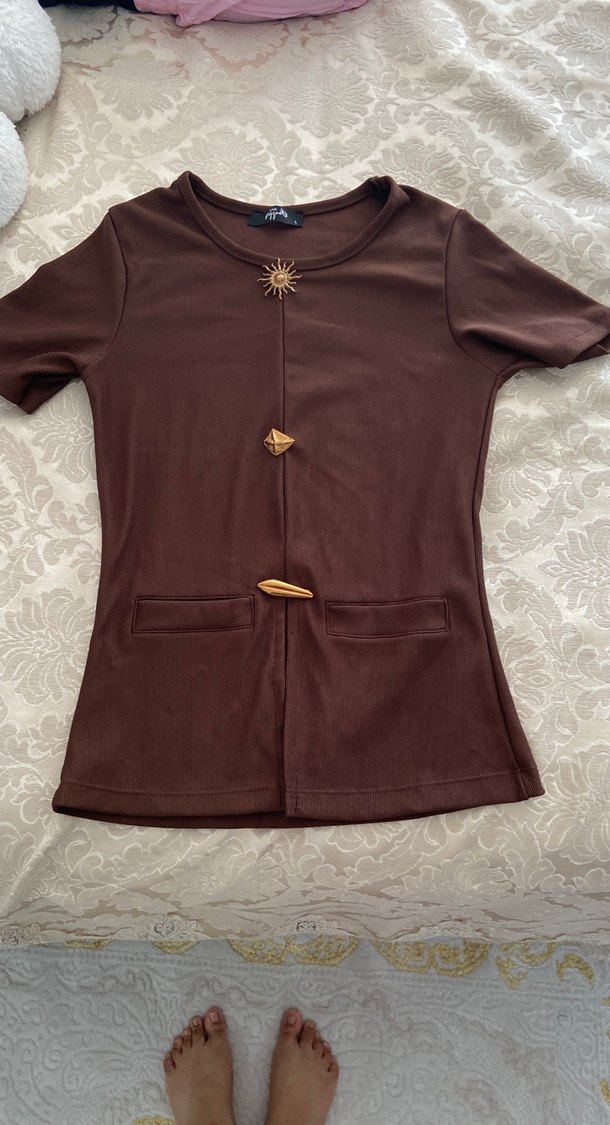 Kahverengi süet, kısa kollu ve yuvarlak yakalı, önünde özgün düğme detayları bulunan vücuda oturan bluz. Minimalist ve bohem tarzda, ofis için uygun.