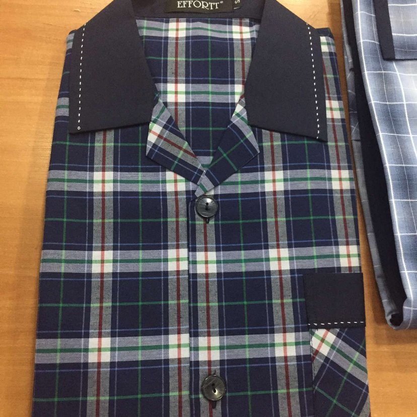 Düğmeli, kısa kollu, klasik kareli desenli, regular fit erkek pijama. Notch yaka ve koyu renk tonlarında, EFFORTT etiketli.