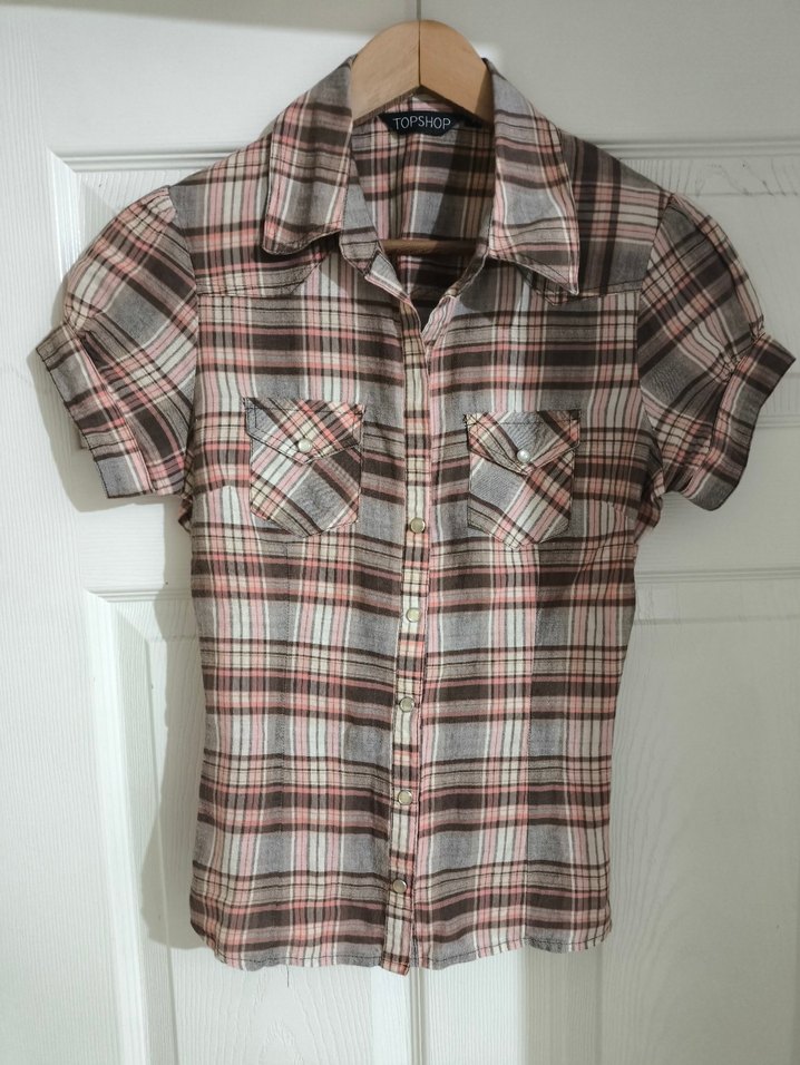 Düğmeli, kısa kollu, yakalı kadın gömlek. Rahat kesimli, bej tonlarında kareli desene sahip, nefes alabilen keten kumaştan üretilmiştir. Günlük rahat sokak stili için uygundur.
