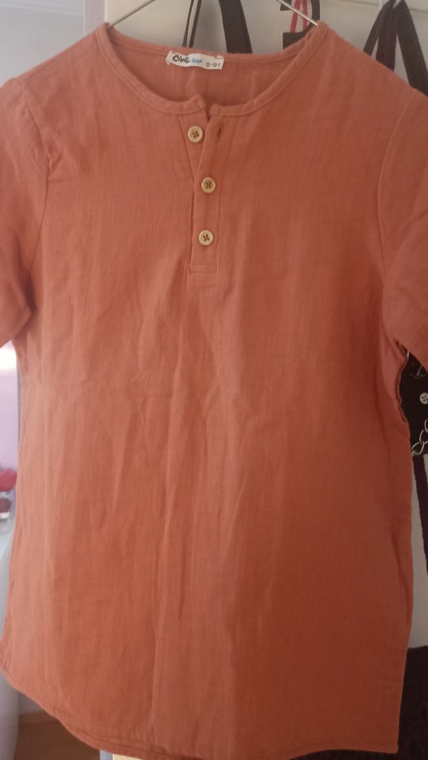 Düğmeli ön kısım, kısa kollu ve yuvarlak yaka detaylarına sahip keten-müslin kumaş 12-13 Yaş rahat gömlek- tişört gibi giyilebilir. takım olarak almıştım, oğlum altını giydi üstünü 1 kere denemedi yepyeni alındığından beri askıda beklemektedir.