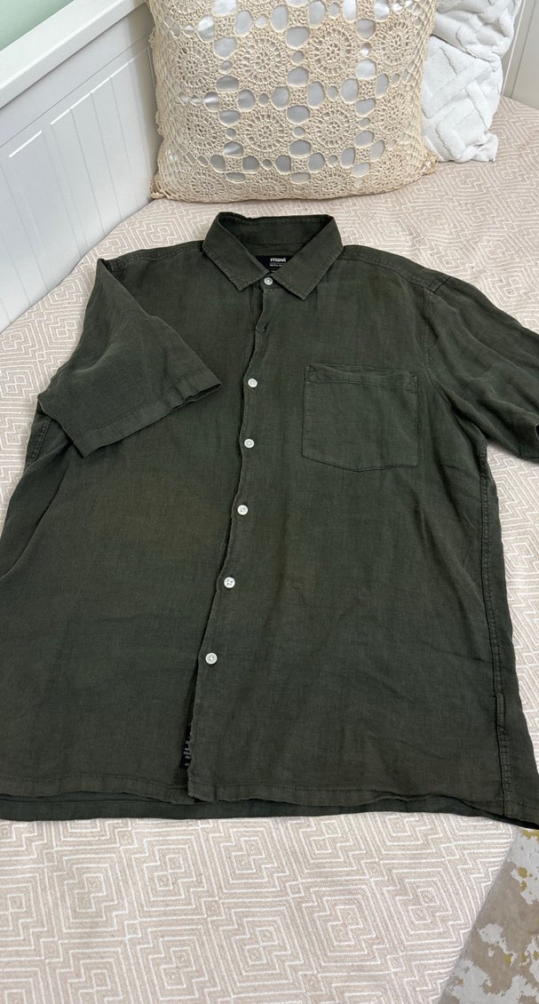 Keten kumaştan, düğmeli, kısa kollu, yakalı ve cep detaylı bol kesim erkek gömleği. Günlük rahat sokak stili için uygundur.