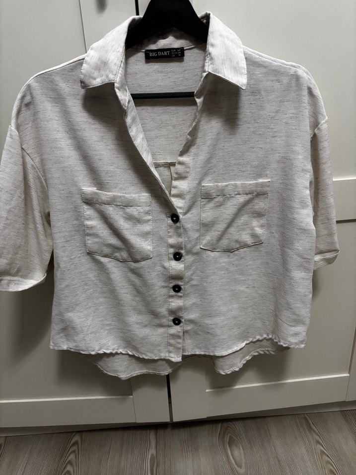 Bol kesim, kısa boy keten gömlek, düğmeli ve yakalı, iki ön cepli. Günlük sokak stiline uygun.