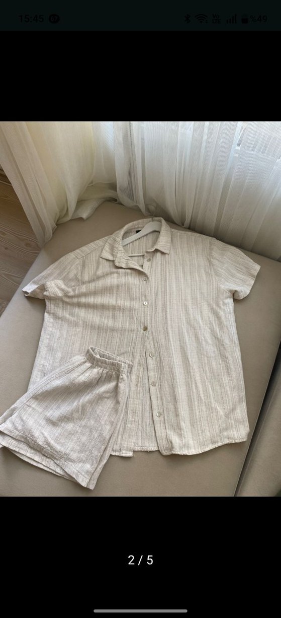 Hafif krem tonlarda, düğmeli ön kısmı ve yakalı kısa kollu, keten kumaştan bol kesim gömlek ve şort takımı. Rahat günlük kullanım için uygundur.