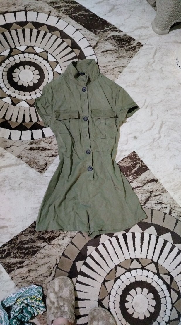 Düğmeli ön kısmı, yakalı ve kısa kollu, keten kumaştan yapılmış, gri haki kamuflaj desenli, dar kesim kadın kısa tulum.