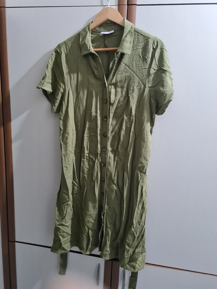 Haki renkli keten midi elbise, yakalı, kısa kollu ve bol kesimdir. Düğmeli ön kısmı ve minimalist sokak stiliyle günlük kullanıma uygundur.