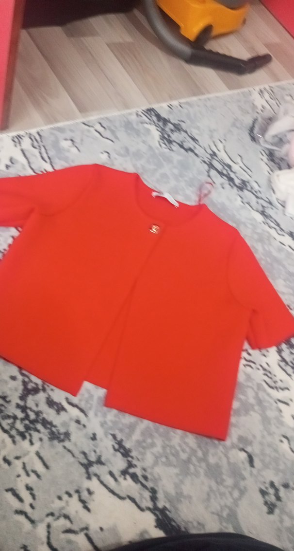 Renkli kırmızı, kısa kollu, düğmeli ve kısa kesim hamile hırkası. Rahat kesimli, yumuşak ve sıcak dokulu kumaştan üretilmiştir.