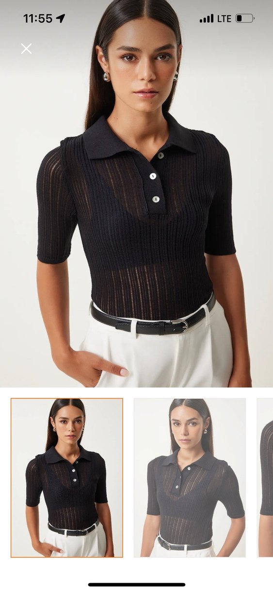 Düğmeli, yakalı, kısa kollu ve vücuda oturan bu bluz, hafif şeffaf çizgili dokusu ve yumuşak sentetik kumaşıyla dikkat çeker.