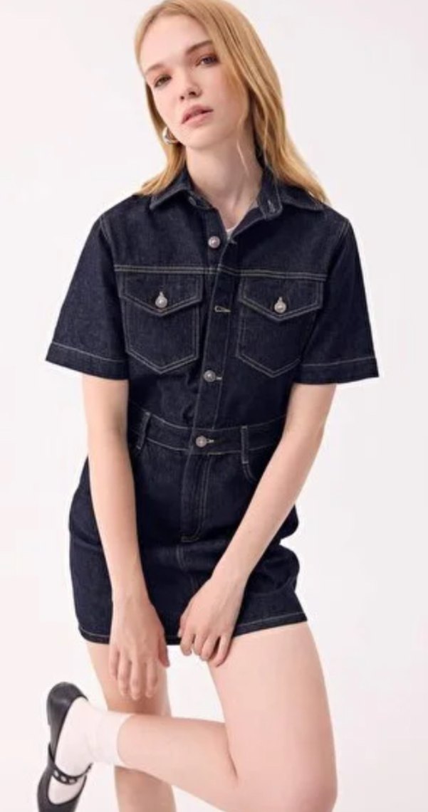Lacivert denim elbise, kısa kollu, yakalı ve düğmeli. Rahat kesimi ve kısa boyuyla günlük sokak stiline uygun.
