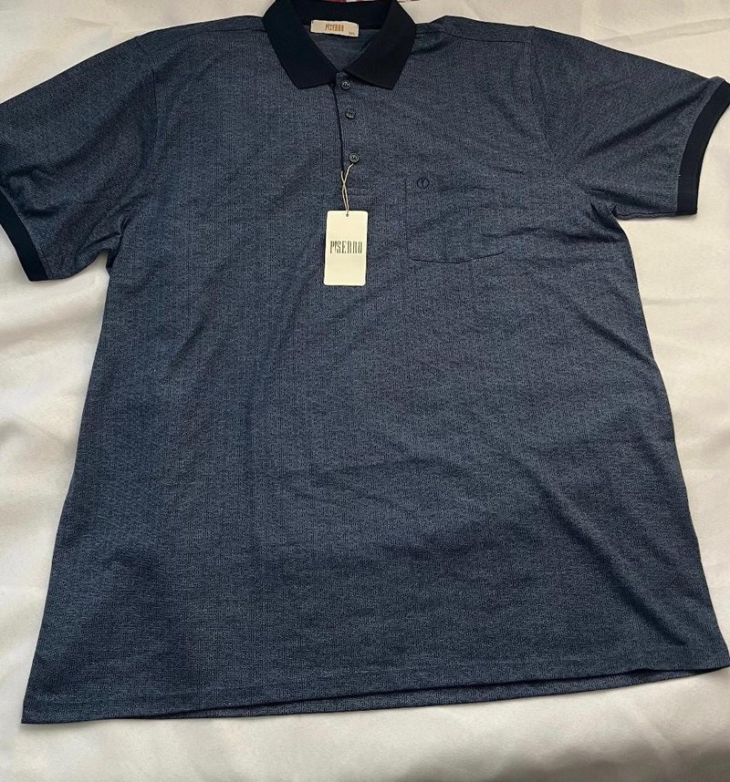 Düğmeli, kısa kollu, yakalı, lacivert ve gri tonlarında baskılı denim kumaştan yapılmış, bol kesim erkek polo tişört. Günlük sokak stiline uygundur.