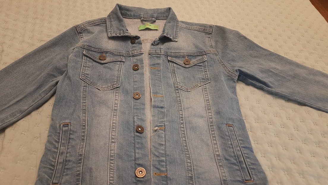 Düğmeli, kısa kollu, çentikli yaka ve normal boyda mavi denim cekettir. Rahat sokak stili için uygundur.