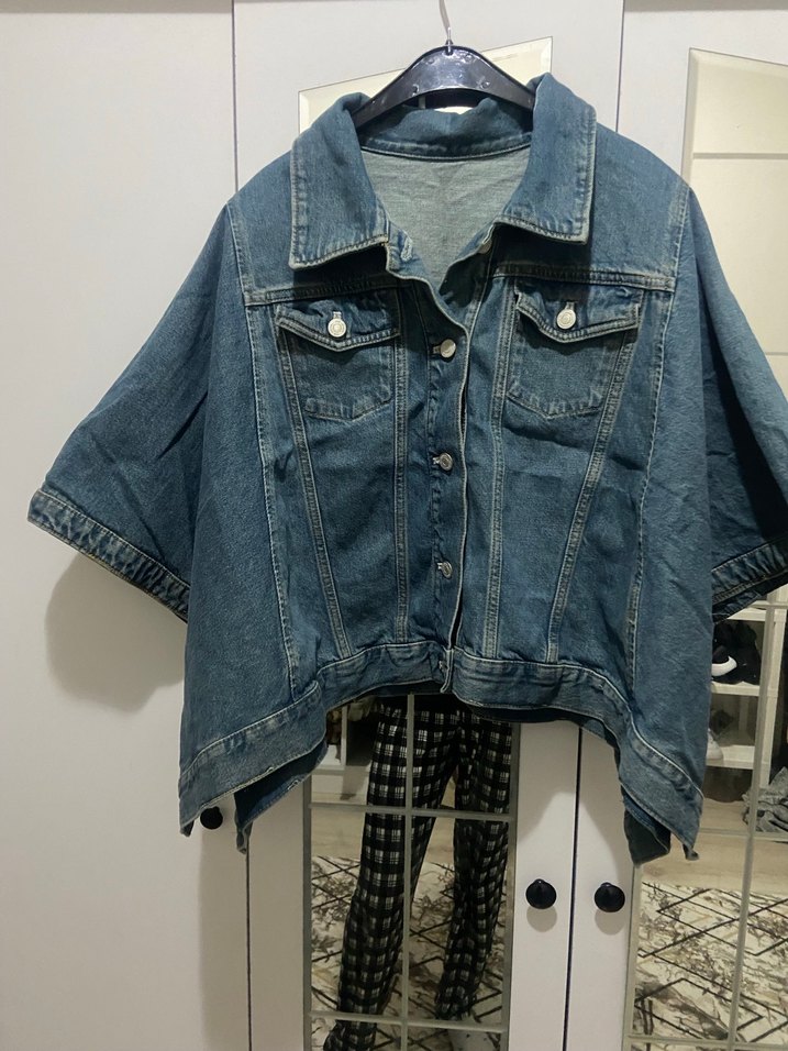 Düğmeli, kısa kollu, bol kesim mavi denim ceket. Notlu yaka ve sokak tarzı görünümüyle günlük kullanıma uygun.