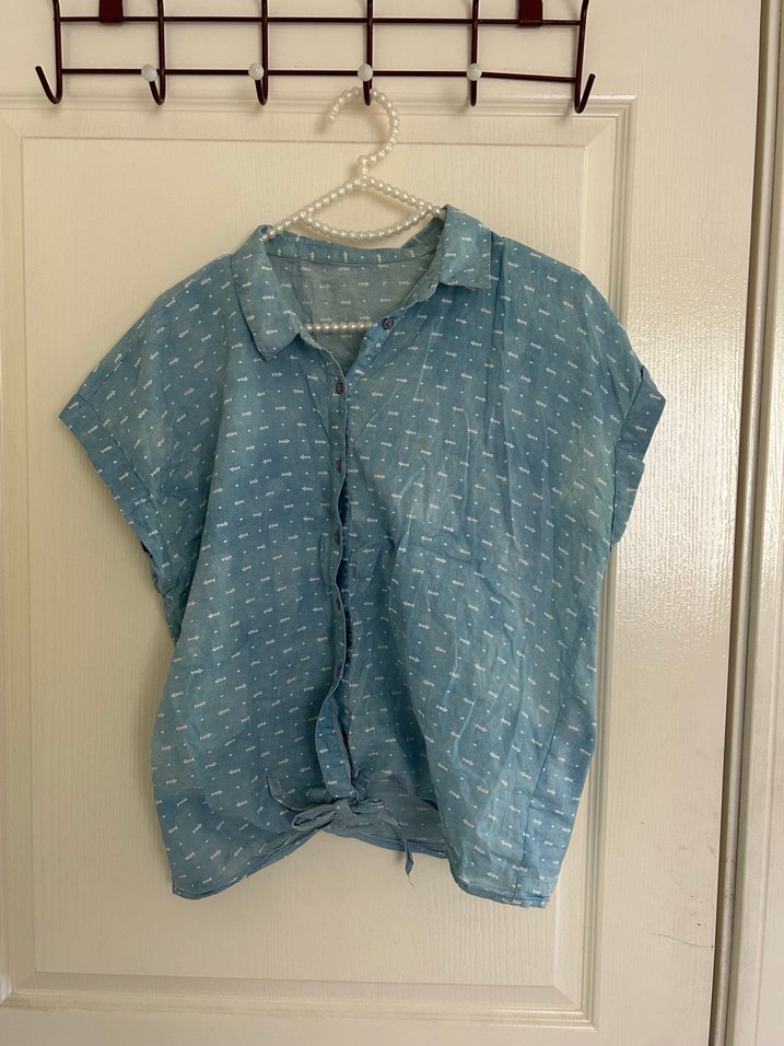 Bu bol kesim denim gömlek, kısa kollu, düğmeli ve yakalıdır. Pastel mavi batik desene sahip, normal midi uzunluğundadır ve günlük kullanıma uygundur. Bazı lekeler var görselde belirttim