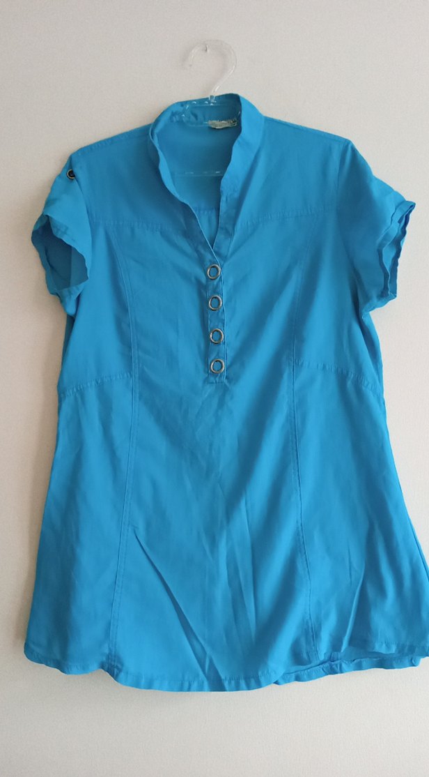 Mavi renkli, kısa kollu, düğmeli ve yakalı kadın gömleği. Rahat kesim ve midi uzunluğunda, yumuşak keten kumaştan, günlük kullanıma uygun. rengi turkuaz en 50 boy 72 marka temsili