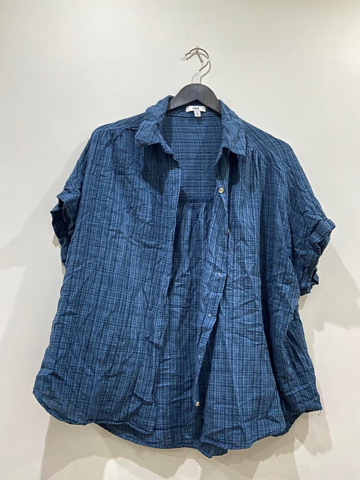Gevşek kesim, kısa kollu, yakalı mavi keten gömlek. Düğmeli önü ve hafif batik deseniyle günlük kullanıma uygun.