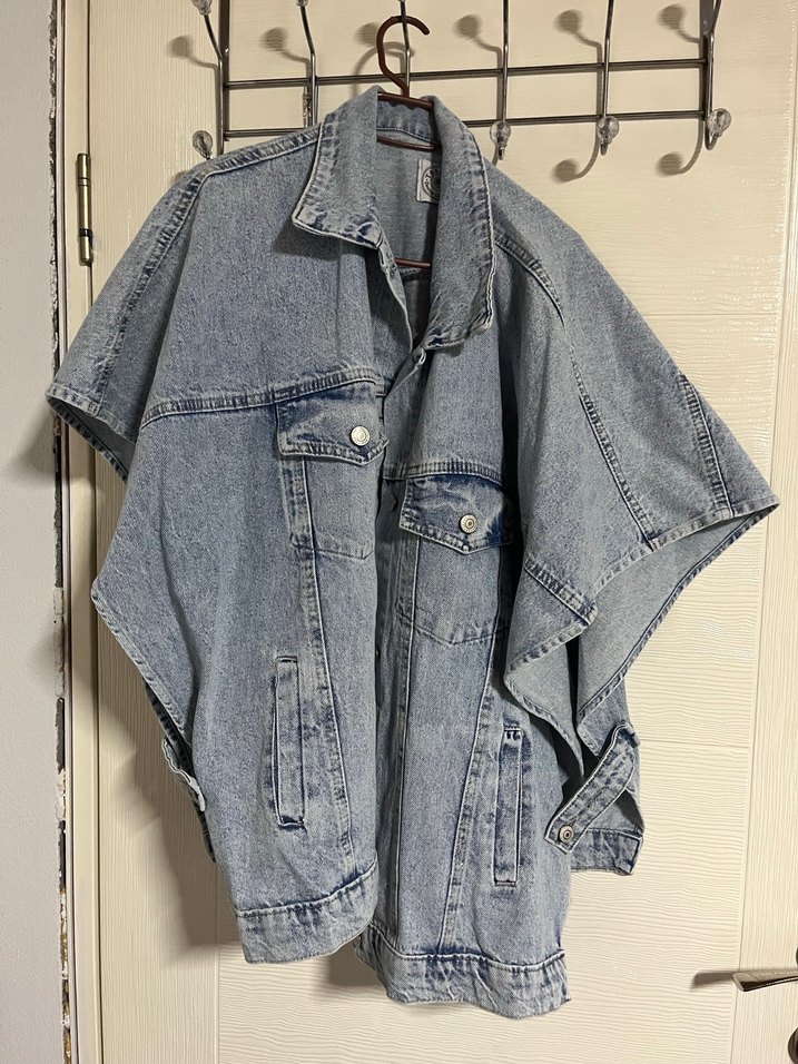 Düğmeli, kısa kollu, bol kesim mavi kot ceket. Normal boyda, çentikli yaka detaylı, günlük rahat kullanım için uygundur.