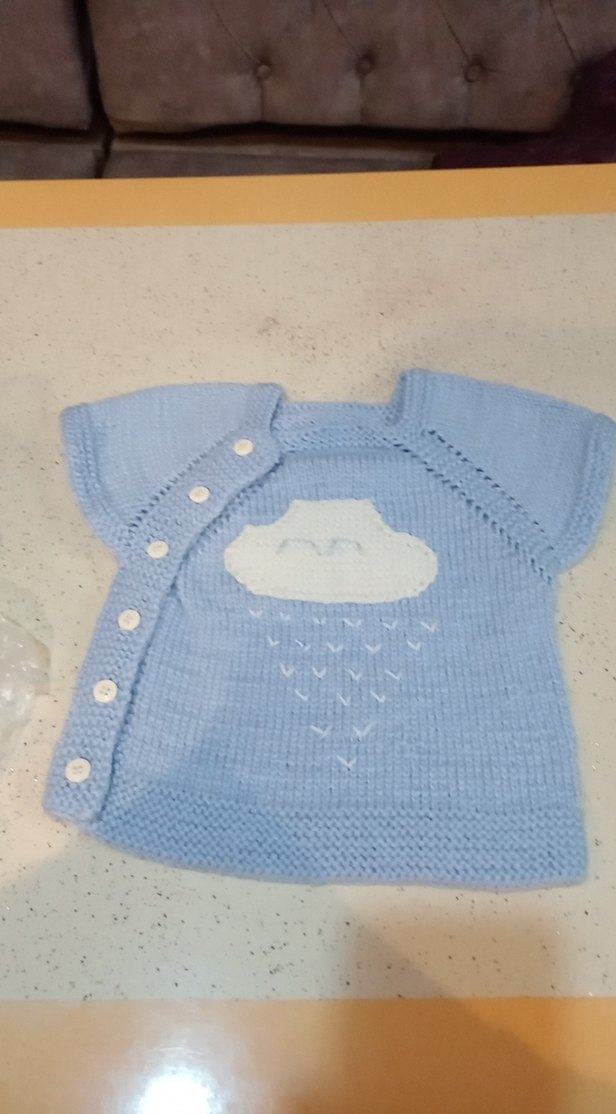 mavi renkte, kısa kollu ve yuvarlak yakalı örgü bebek yelegi Yan tarafında düğmeler ve önünde bulut desenli, günlük kullanıma uygun.