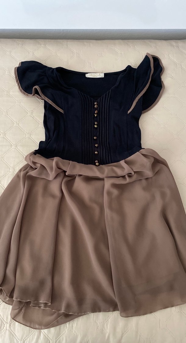 Düğmeli ön kısmı ve kısa kollu, bol kesim midi elbise. Koyu üst ve bej etek kısmı ile modern klasik tarzda. S/m beden uyumludur