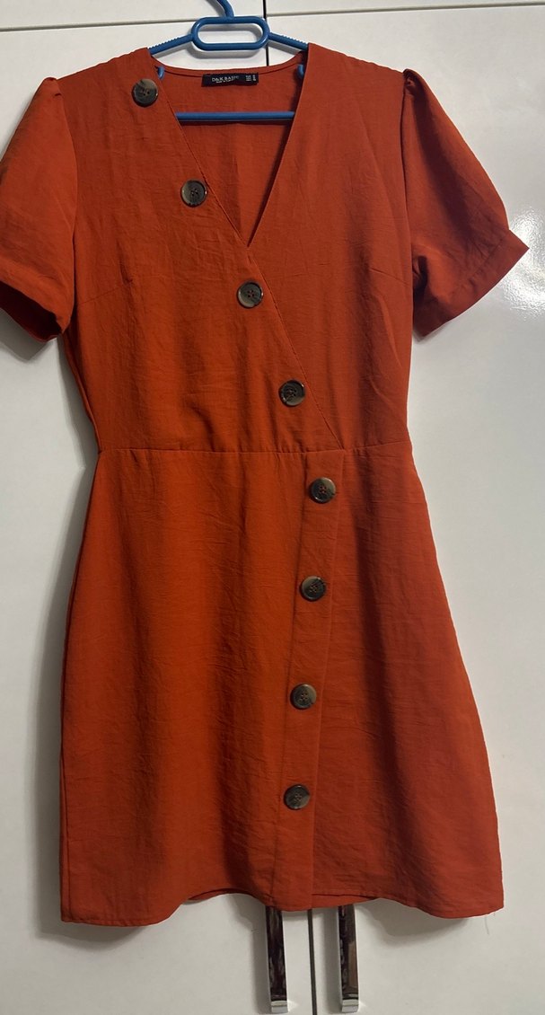 Düğmeli, kısa kollu ve V yakalı bu midi elbise, koyu kahverengi sentetik kumaştan yapılmıştır. Minimalist bohem tarzıyla günlük kullanıma uygundur.