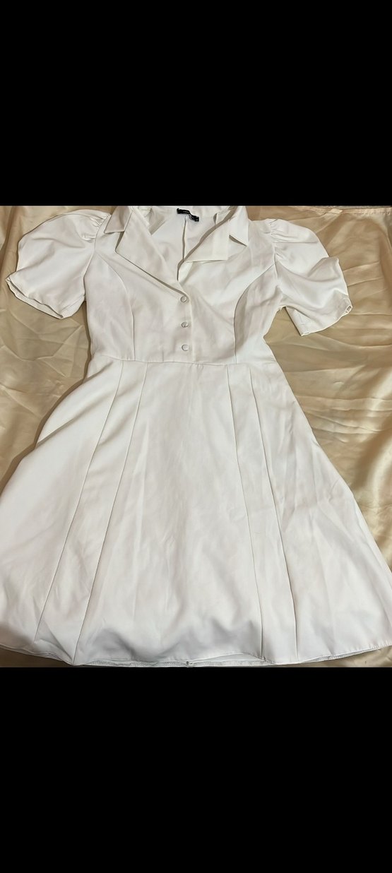 Düğmeli, kısa kollu, keten kumaştan yapılmış beyaz midi elbise, klasik ve ofis kullanımı için uygundur. Notched lapel yaka ve vücuda oturan kesime sahiptir. Fotoğraf da belirttiim yerde ufak bir kusur var