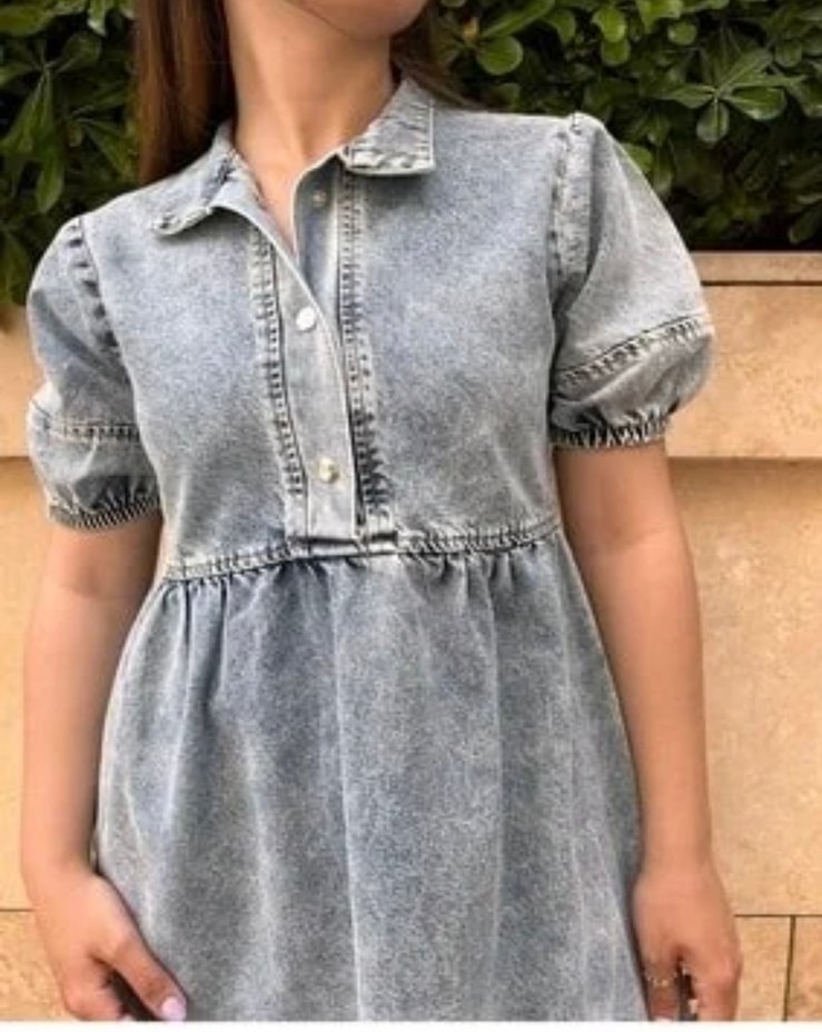 Düğmeli önü, yakalı ve kısa kollu, bol kesim midi kot elbise. Hafif batik desenli, günlük rahat stil için uygun. Hiç kullanılmadı
