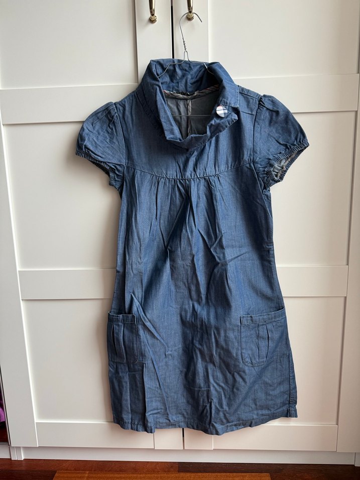 Düğmeli, kısa kollu, yakalı ve fitted kesim midi kot elbise, günlük rahat kullanım için uygundur.