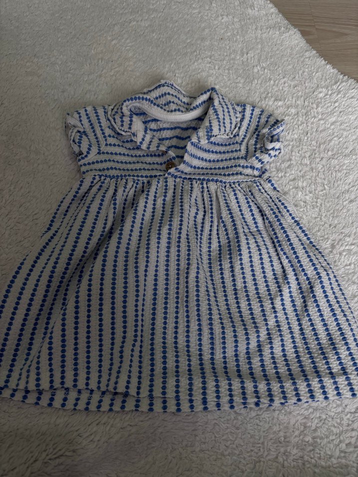 Düğmeli, kısa kollu, yakalı ve nakışlı desenli, bol kesim kız çocuk elbisesi. Mavi tonlarında bohem tarzda, tekstil kumaştan.