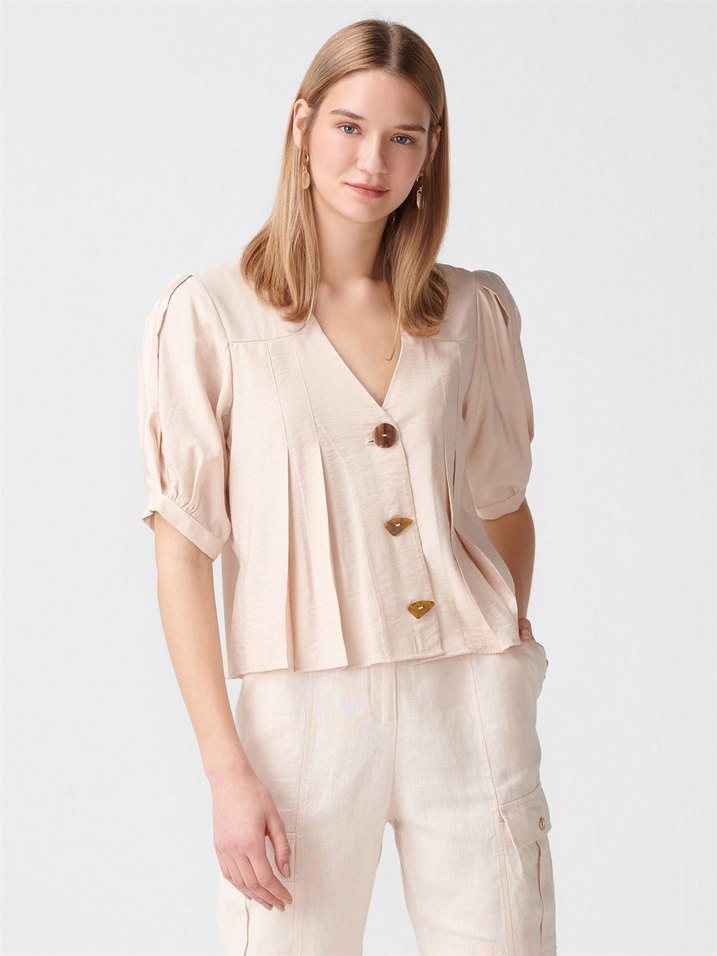 Düğmeli ön kısmı ve V yaka detaylı, kısa kollu, bol kesim pembe bluz. Günlük sokak stili için uygundur. Pilili V Yaka Düğmeli Bluz-Açık Bej Ürün İçeriği : %88 Viskoz %12 Naylon Modelin Ölçüleri : Boy : 180 Göğüs : 83 Bel : 61 Kalça : 89 Numune Bedeni : S/36/1 Ütüsü olmadığı için ilk görselleri ekledim.