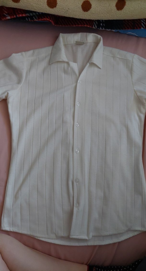 Düğmeli, kısa kollu, beyaz penye kumaştan yapılmış klasik erkek gömleği. Yakalı ve düz desensiz, normal kesim, ofis kullanımı için uygundur. Ürün az kullanılmıştır ve herhangi bir hatası yoktur.