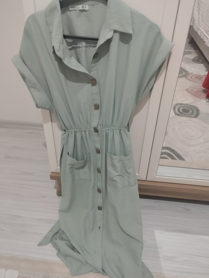 Pastel bej renkte, yumuşak keten kumaştan yapılmış, düğmeli, kısa kollu ve V yakalı uzun, salaş kesim elbise. Cep detaylı, günlük rahat sokak stili.