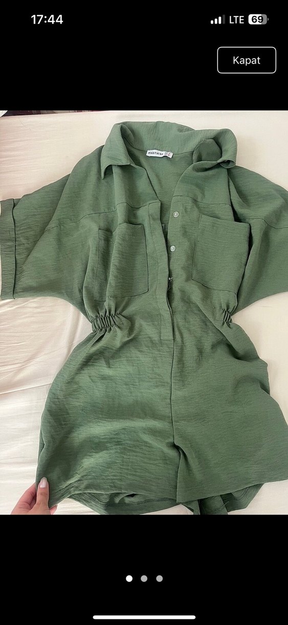 Yeşil keten tulum, düğmeli ön ve kısa kollu, bol kesim, midi boy ve elastik bel detayı ile rahat kullanım sunar. Sade, bohem tarzda günlük kullanıma uygundur.